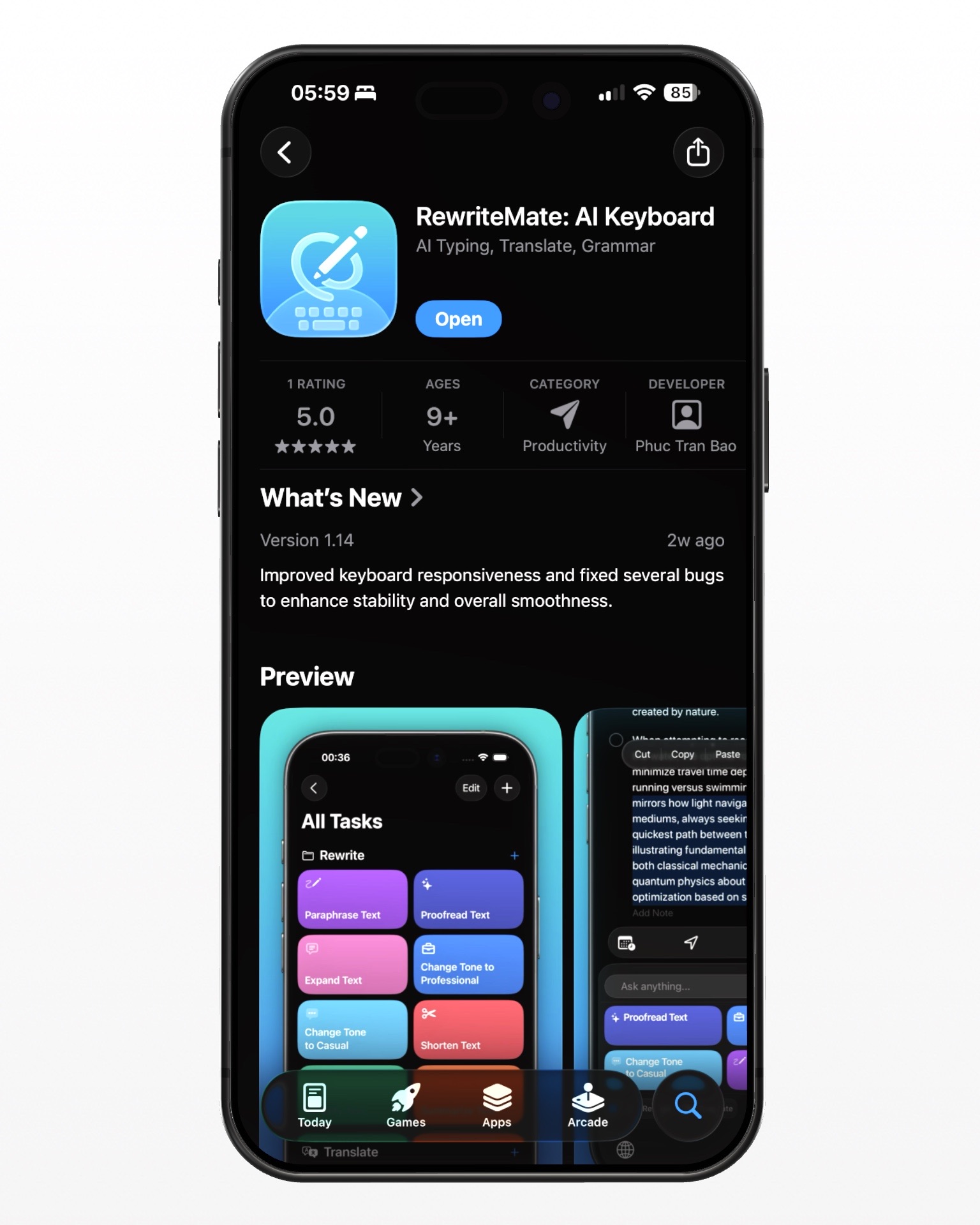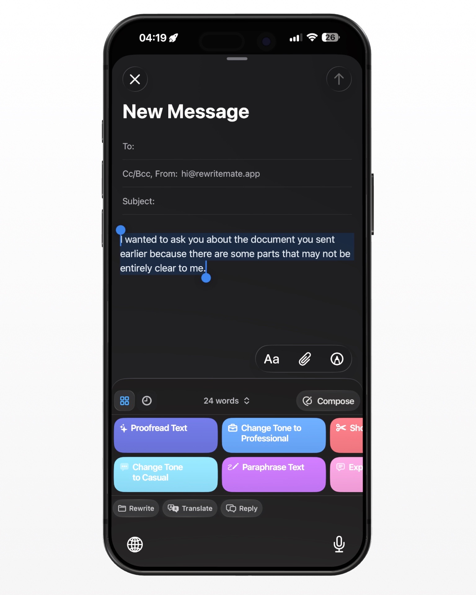 Try it out. If you want to write professional emails without the copy-paste headache, there's a keyboard that does exactly this — right inside whatever app you're using. You can download RewriteMate on the App Store and have it running before your next message.