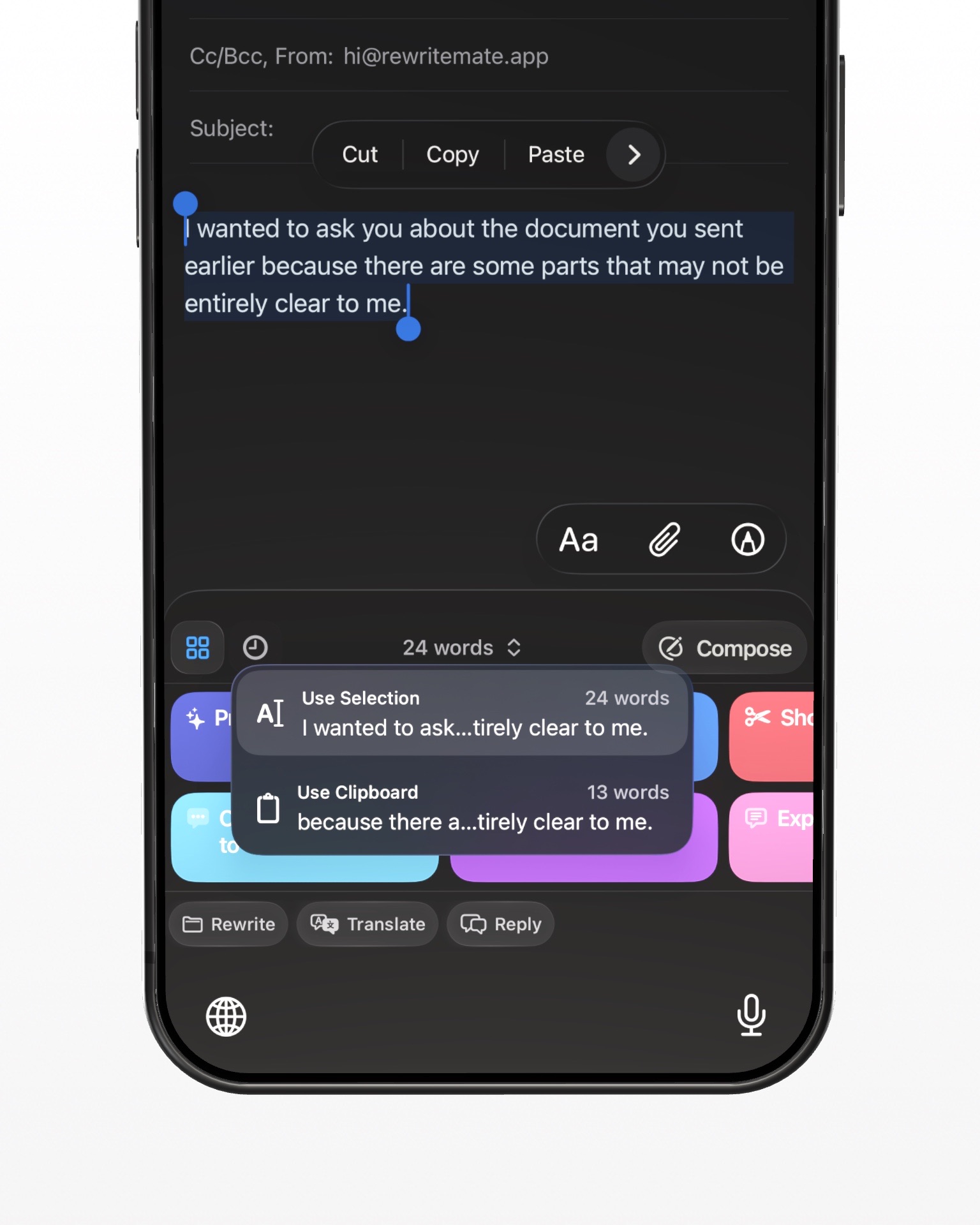 But here's the friction: to make your email sound better, you normally have to copy your text, paste it into a grammar app or ChatGPT, wait for results, then copy everything back. That's too many steps when you just need to send the email.